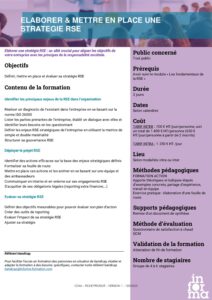 M2_Stratégie RSE_ Elaboration & mise en place Date 15 mai 2025 Comments 0 comment Programme de formation INFORMA – Elaboration et mise en place d’une stratégie RSE Share: You may also like Les inscriptions 2025-2026 sont ouvertes ! 28 août, 2025 Nouvelle offre de formation RSE : Informa vous accompagne vers une stratégie responsable 16 mai, 2025 Informa lance ses stages d’été 2025 : formez-vous en couture, patronnage et moulage 12 mai, 2025